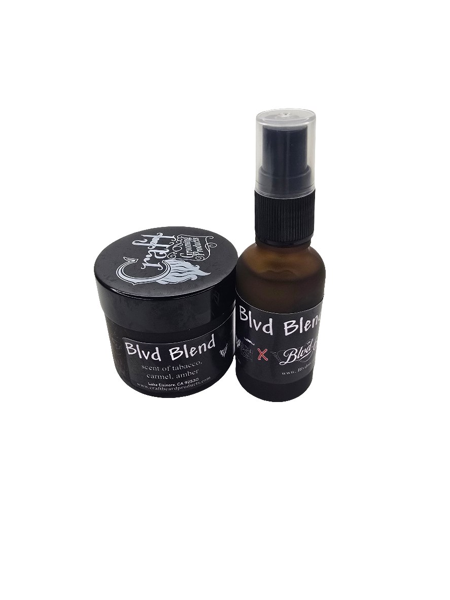 Shop Blvd Blend oil and balm!This beard oil and balm collaboration is with Blvd 66 and has the scent of tobacco, caramel, and amber